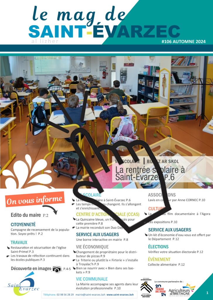 Le Mag’ de Saint-Évarzec – Automne 2024 Actualité | Er mare-mañ 17 octobre 2024 Le mag’ de Saint-Évarzec (automne 2024) est en cours de distribution sur la commune. Ce magazine trimestriel est gratuit et remis dans chaque boîte aux lettres des habitants. Si vous ne le recevez pas, veuillez le signaler en mairie.