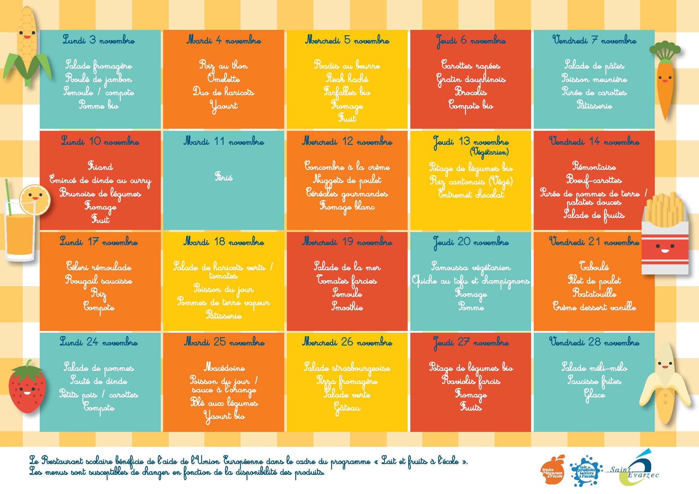 Les menus de novembre 2025 sont arrivés à la cantine de Saint-Évarzec ! Actualité | Er mare-mañ 30 octobre 2025 Les menus de la cantine de Saint-Évarzec pour novembre 2025 sont disponibles ! Découvrez les plats prévus pour ce mois et régalez-vous à chaque repas !